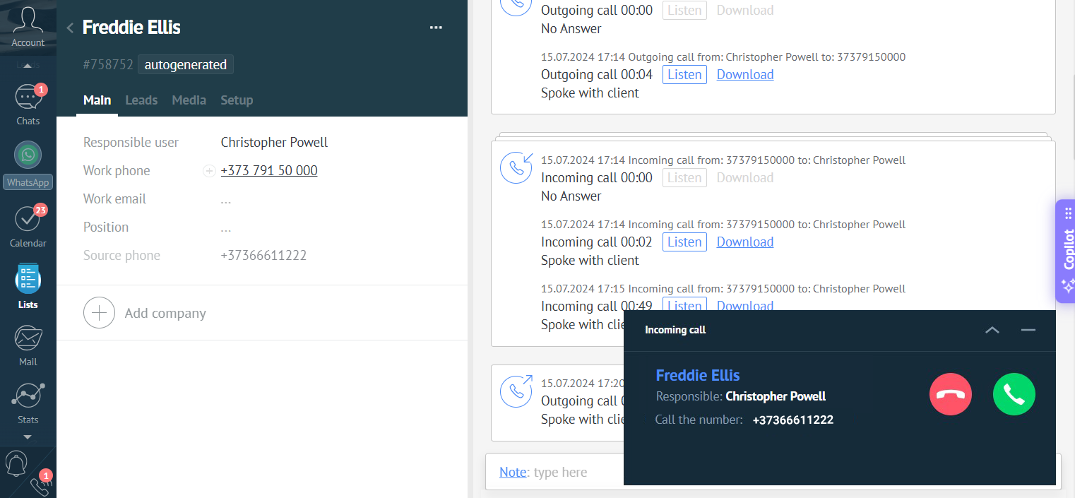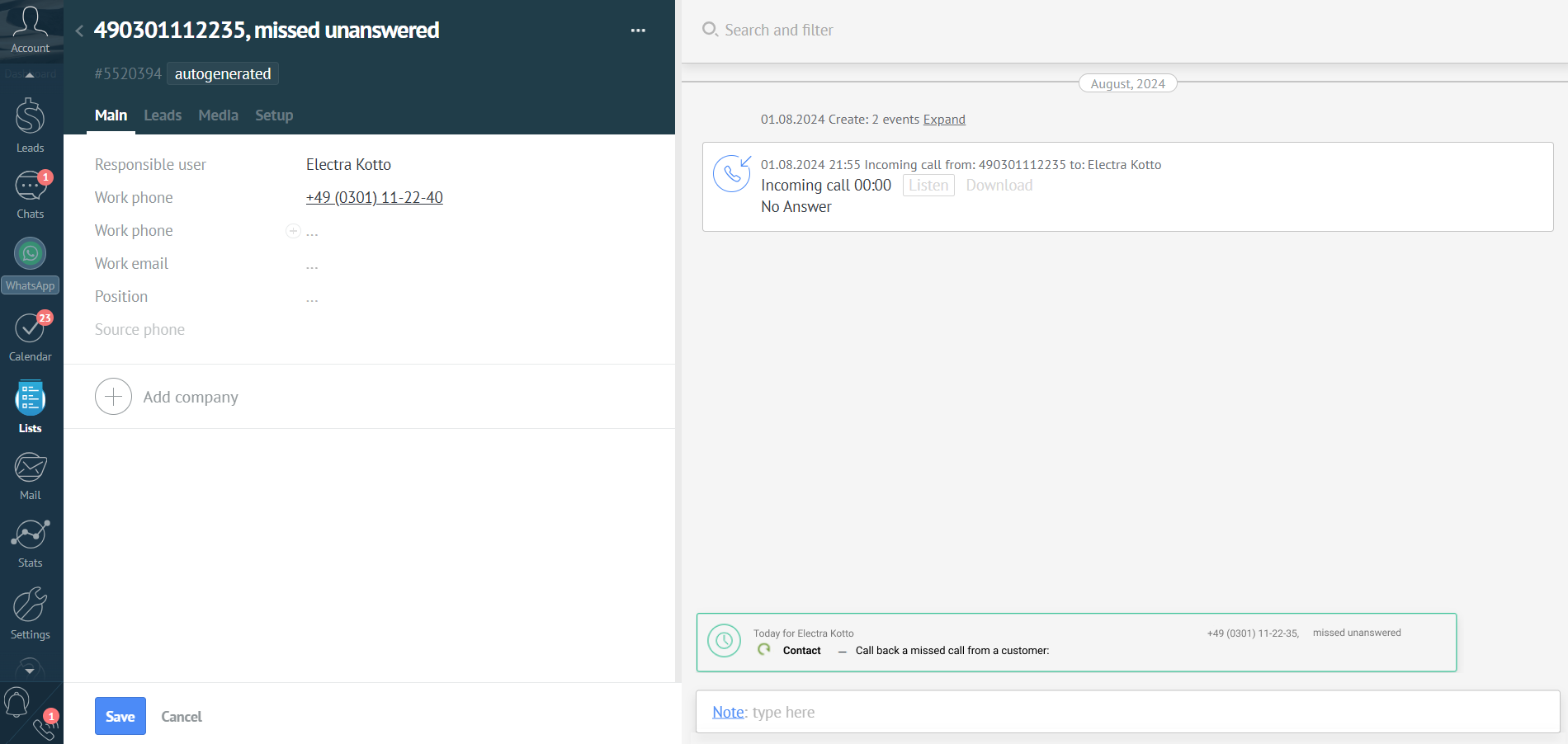 Based on your business needs, you can set up events in Kommo to occur automatically for each type of call (incoming or outgoing, successful or unsuccessful, from a known or unknown number). Kommo can create: