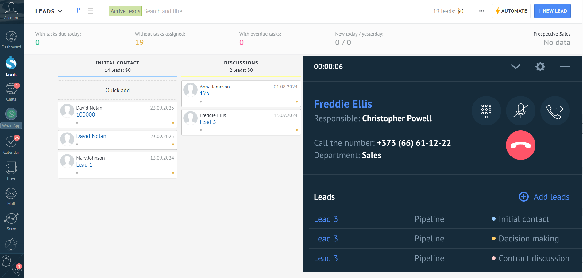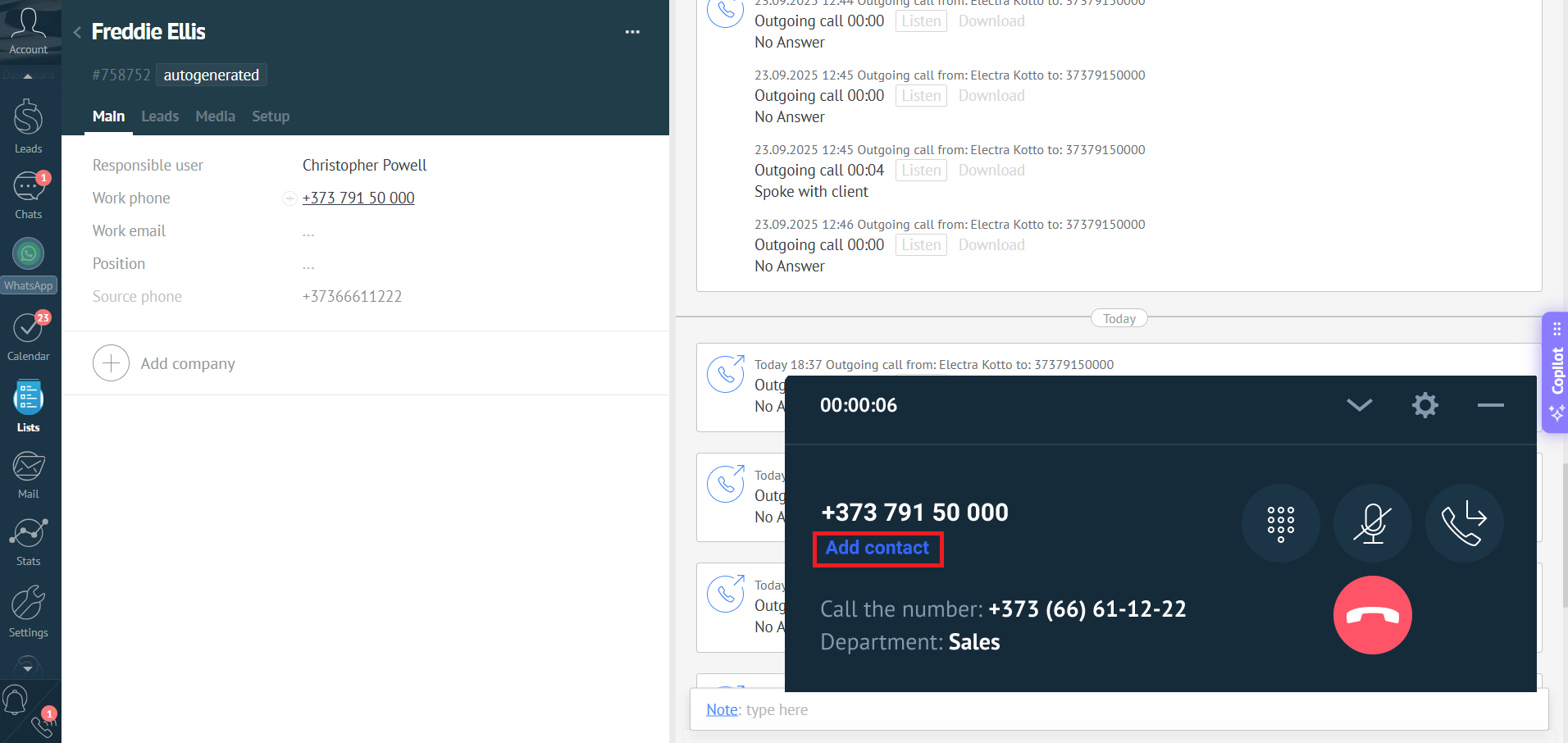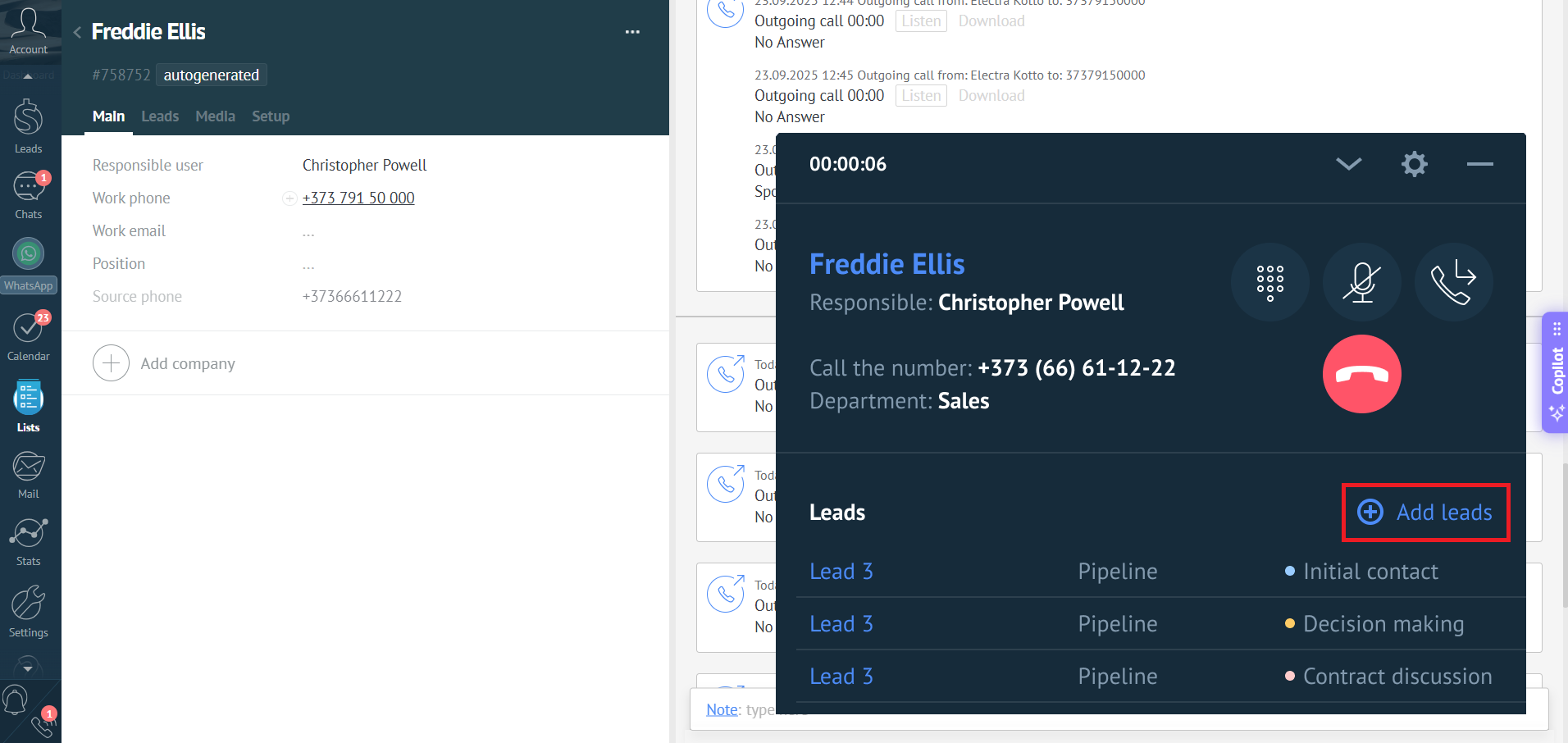 When the call ends, a call results card will pop up through the built-in widget. With this card, the manager won’t forget to record all the necessary information from the call: to create a contact and a lead or select existing ones, as well as assign a task to themselves or a colleague. Learn more about the call results card.