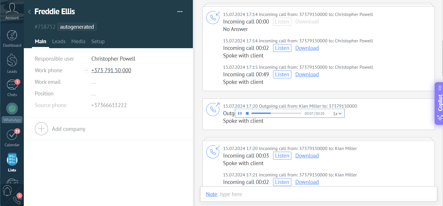 Cloud PBX sends all calls to Kommo. Call recordings can be played back at any time. This allows you to monitor service quality, and managers will behave more politely and professionally knowing that their conversations are recorded.