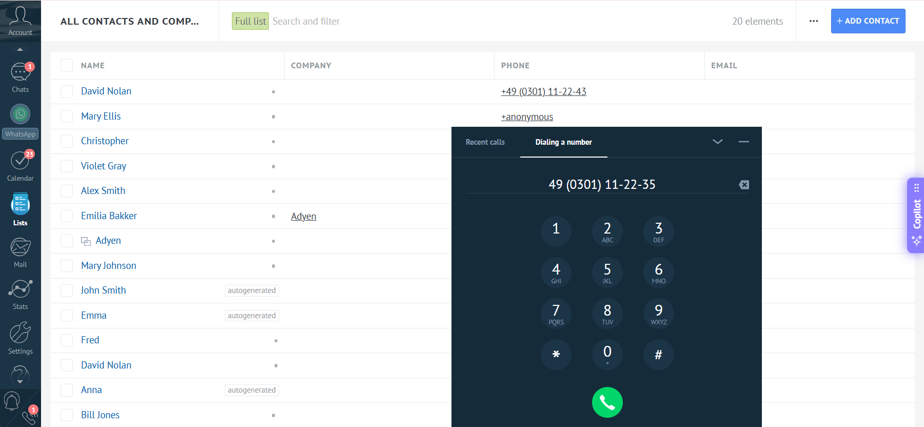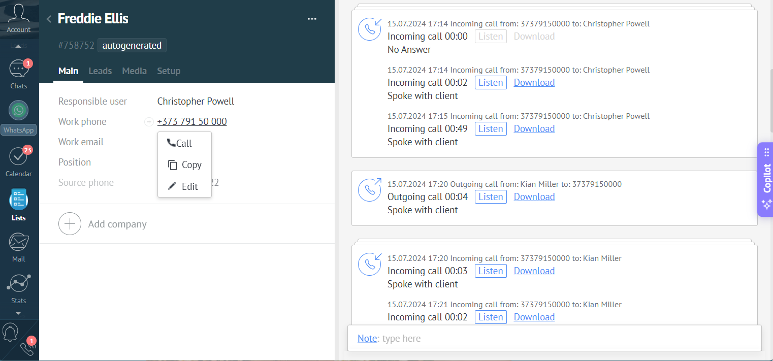 To call a previously saved number, the employee simply opens the contact and clicks the phone number. Clicking allows not only copying or editing the number but also calling the contact directly from Kommo.