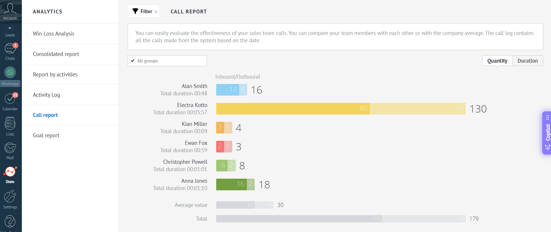 In the Analytics section of your Kommo, you can view the call history of the entire sales department as well as of each manager individually, comparing call quantity and duration against other managers and company averages.