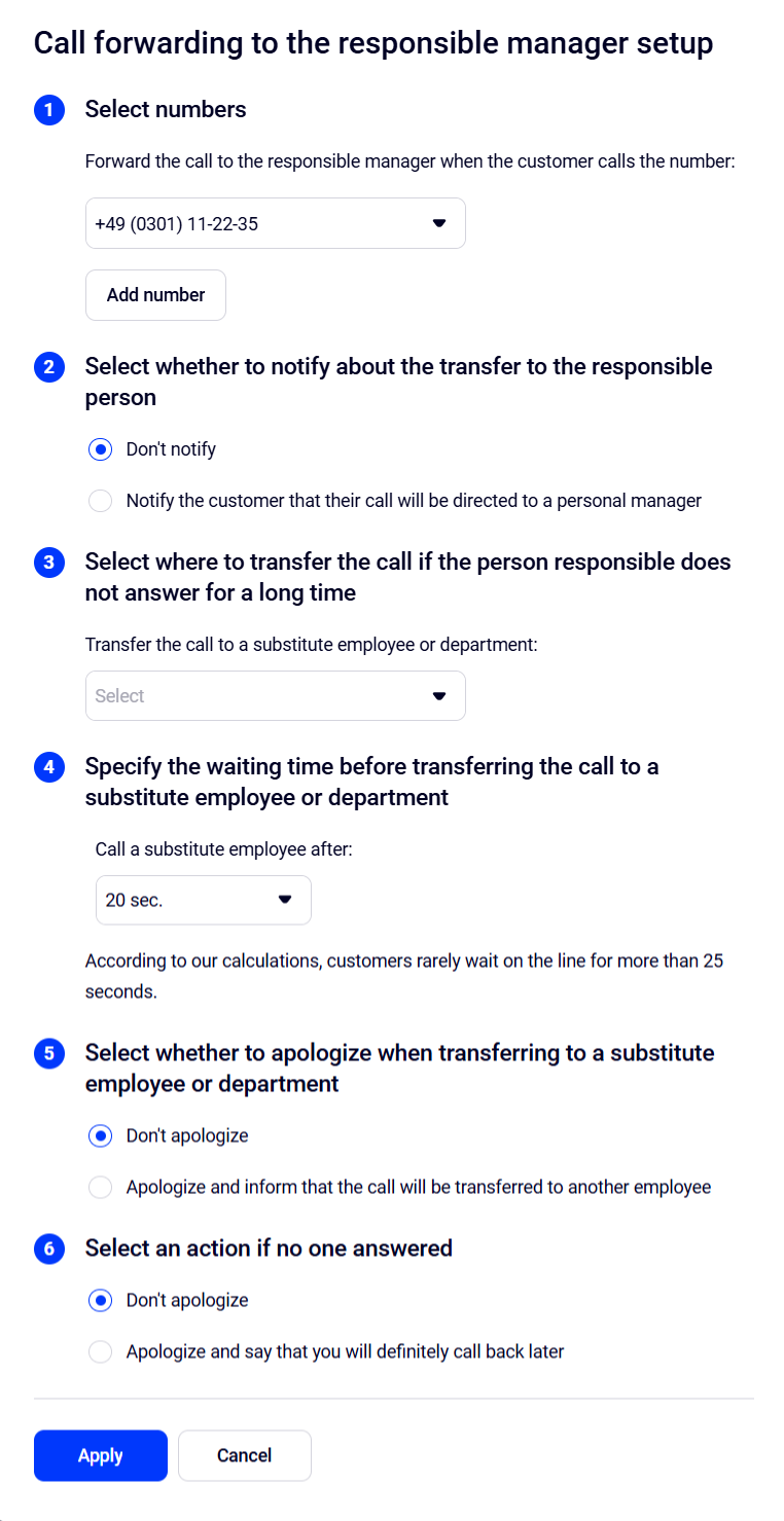If customers are assigned personal managers, calls can be routed automatically – the customer won’t need to listen to the voice menu, talk to a secretary or other managers. Once the customer dials your company number, Cloud PBX routes the call to the responsible manager.