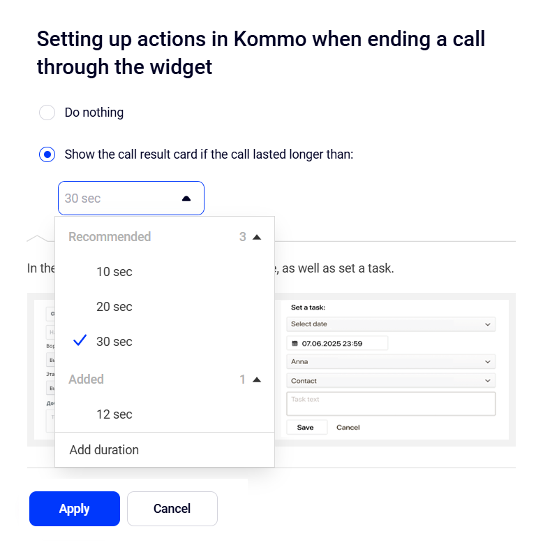 By default, the card pops up after calls longer than 30 seconds so that employees fill in results only for relevant calls. However, if you have a lot of short calls — for example, to confirm service appointments — you can change this setting.