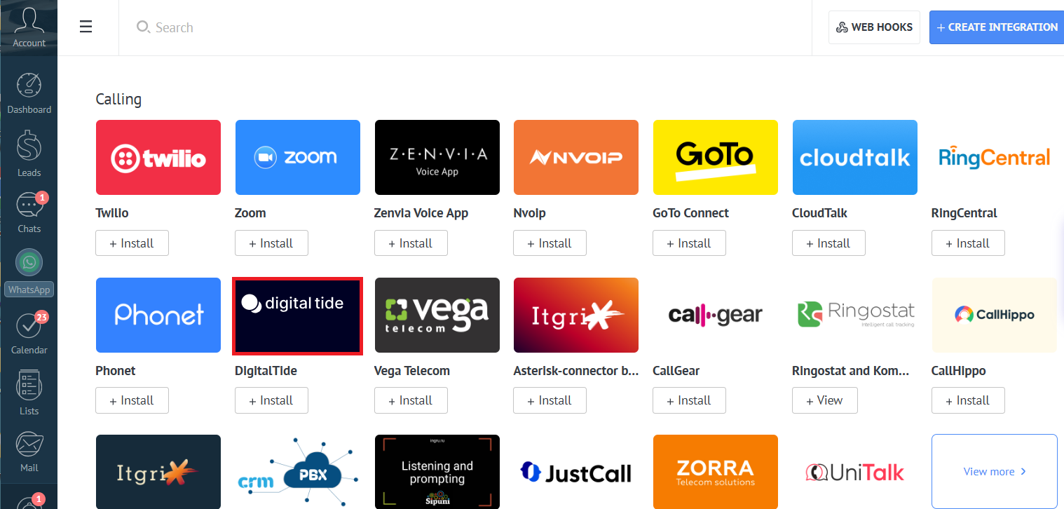 2. In your Kommo interface, go to Settings — Integration — Calling. In the list of available integrations, find the widget of the required operator or enter the operator’s name in the search field. Click Install.