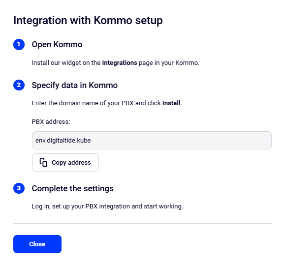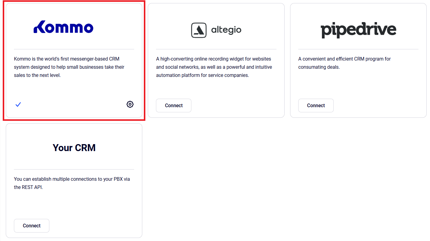 Integration can only be set up by users with administrator rights in both systems.1. In your Cloud PBX, go to the CRM Integration menu. Find the Kommo widget and click it.