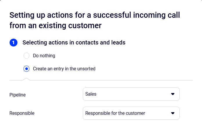 In the Unsorted entry settings, you can select the pipeline and the responsible person: either the employee who answered the call or the one responsible for the customer.