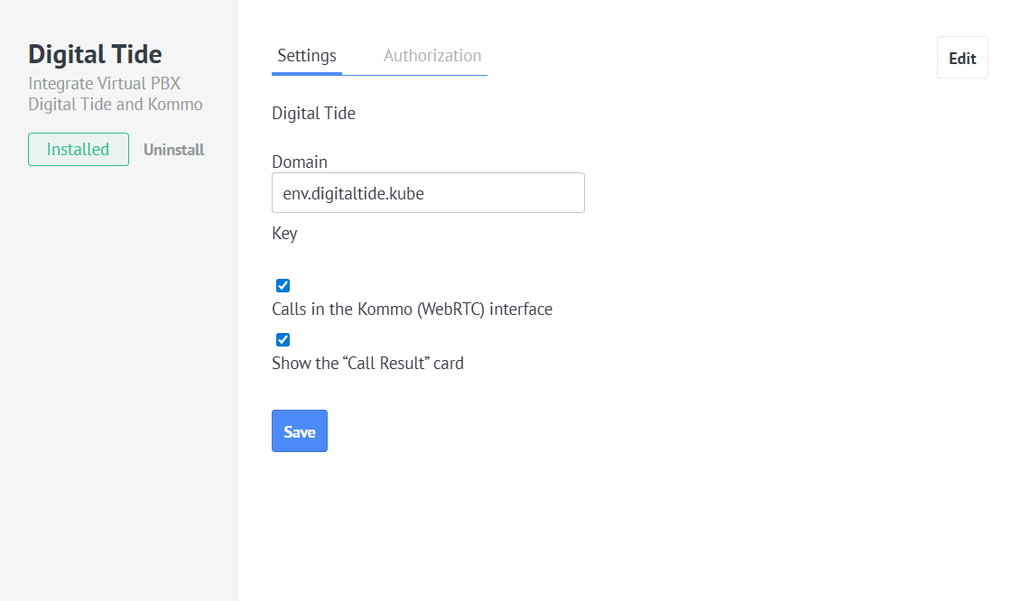 3. In the window that opens, paste your Cloud PBX address. If you want to make calls directly in the Kommo interface, try the WebRTC feature (check the box). Click Save.