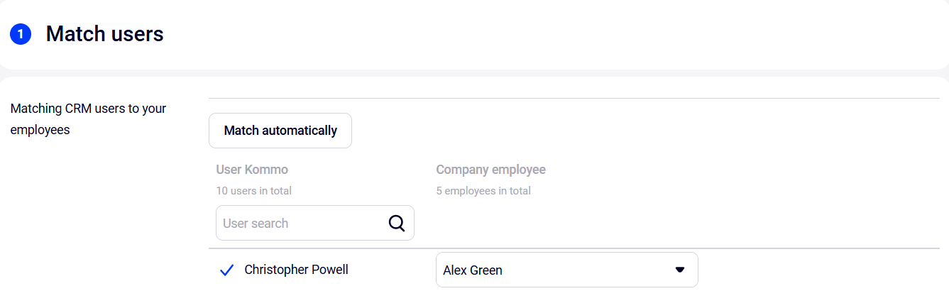 This is necessary so the systems can accurately identify employees and correctly log events associated with them. Only matched users’ calls will be recorded in Kommo. If you add new employees later, don’t forget to make the matching in the integration settings of your Cloud PBX account.