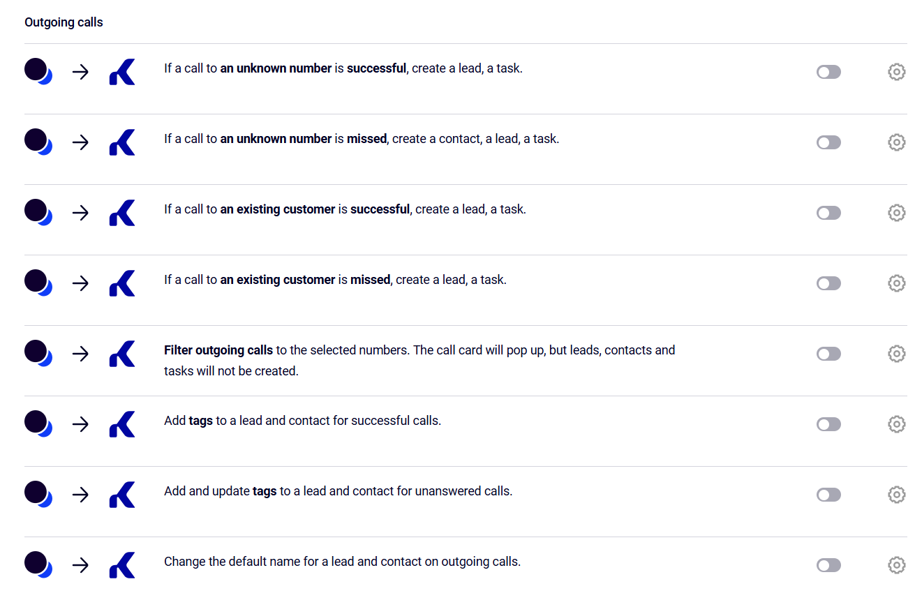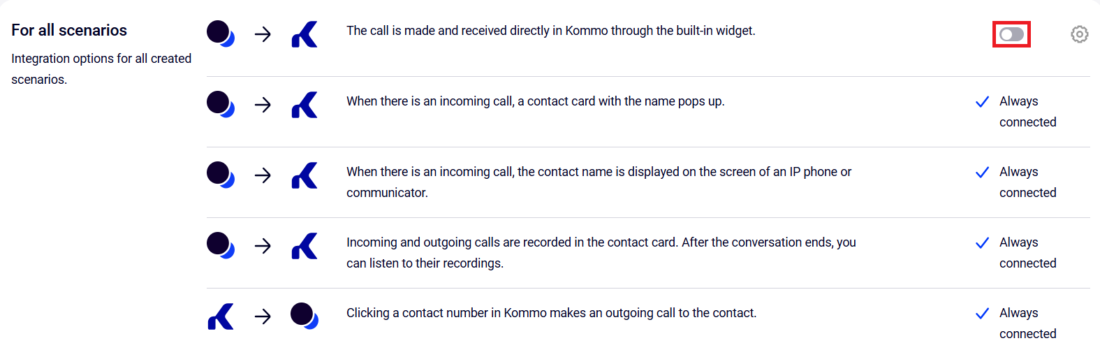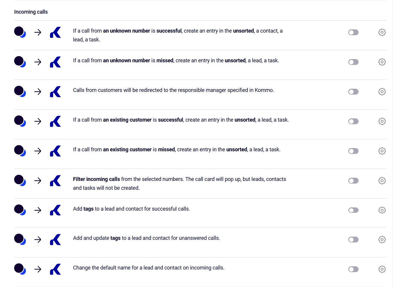 5. Set up Kommo and PBX integration scenarios (rules). Some integration scenarios are connected automatically and can’t be edited.