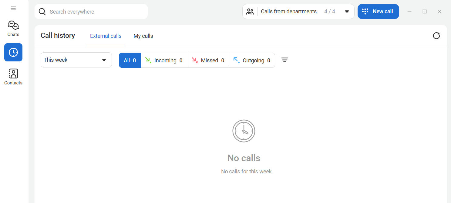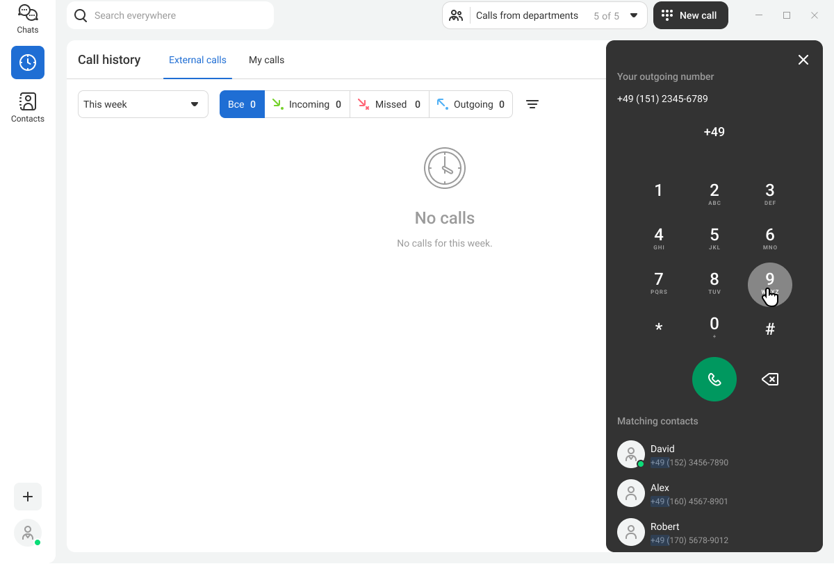- in the top panel — find the required contact or channel, handle incoming calls from the departments you belong to, as well as make calls using the dial pad.