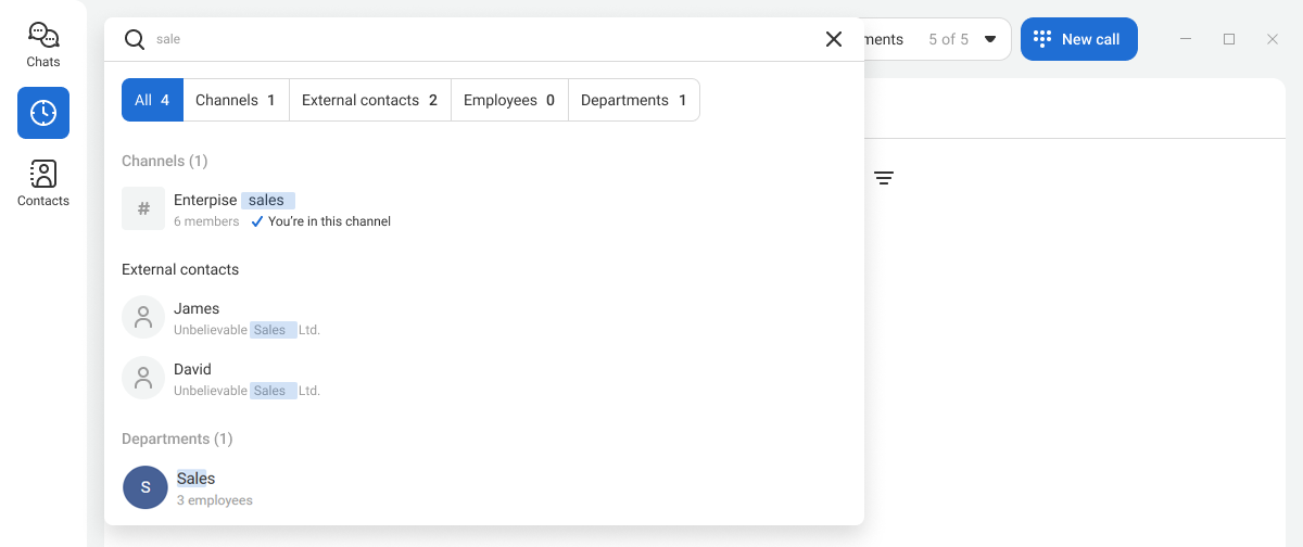 You can also make calls from other sections: from a contact card, the search bar, a chat with a colleague, or from the channel member list.