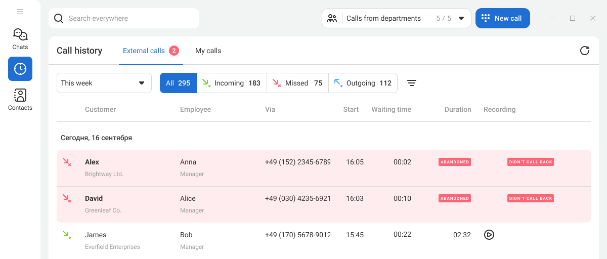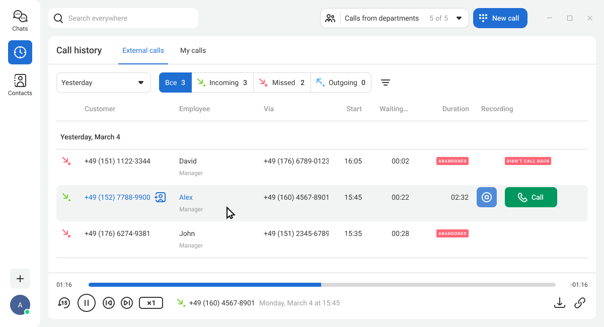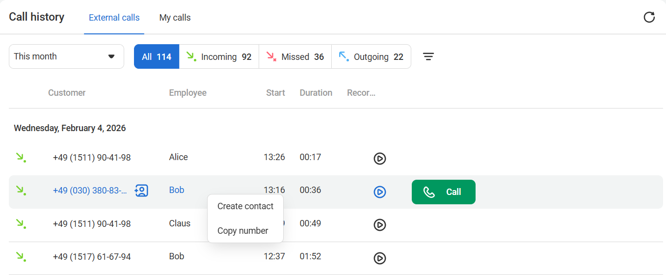 In the call history, you can learn more about a contact and quickly call them back. A flexible filtering system helps you find any call in the archive and listen to its recording if necessary.