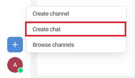 To start a conversation with a colleague in the messenger, click the plus icon in the sidebar and select Create chat.