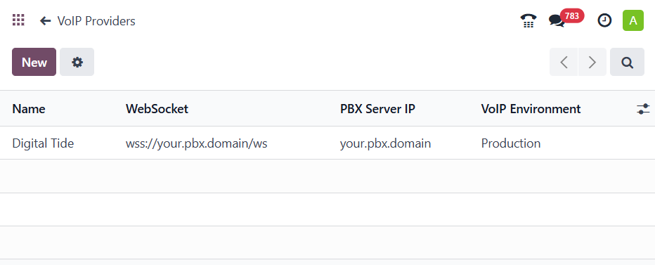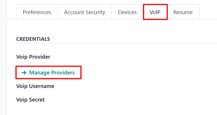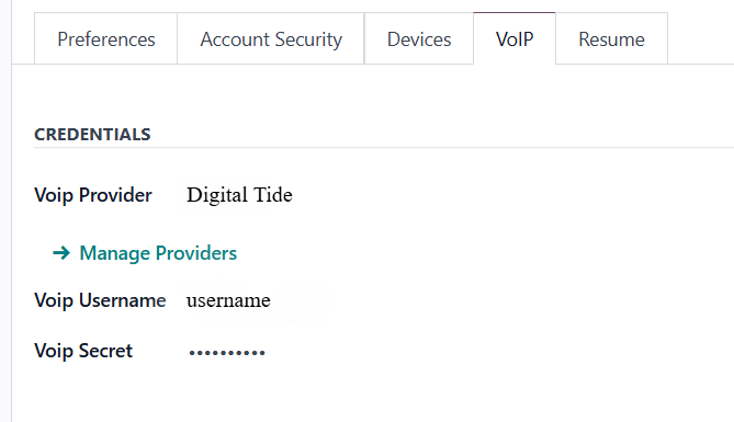 • WebSocket: in the wss:(Cloud PBX Domain)/ws format. * PBX Server IP: your Cloud PBX domain. * VoIP Environment: select Production. 4. Return to the VoIP setup section and select: * VoIP Provider: the provider you specified in the previous step. * VoIP Username: your employee's username in Cloud PBX. * VoIP Secret: the employee's password in Cloud PBX. Done! You can now make and receive calls from customers within the Odoo interface.