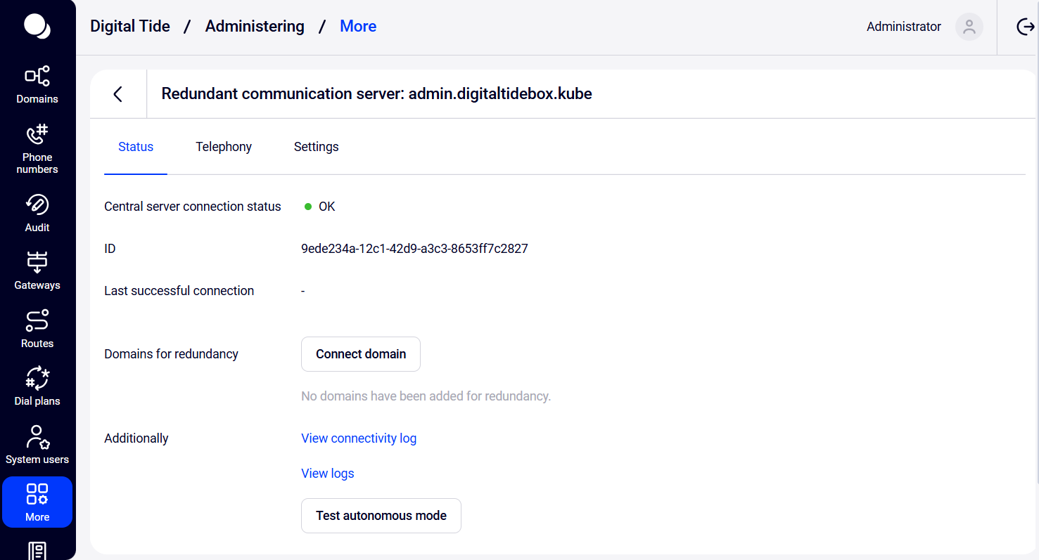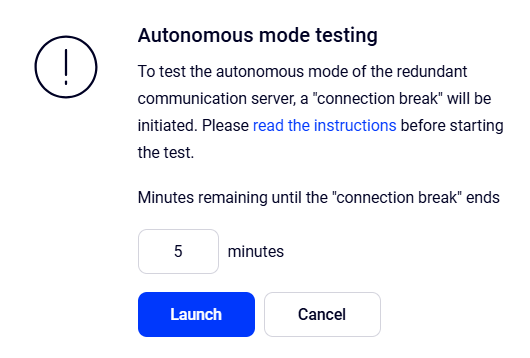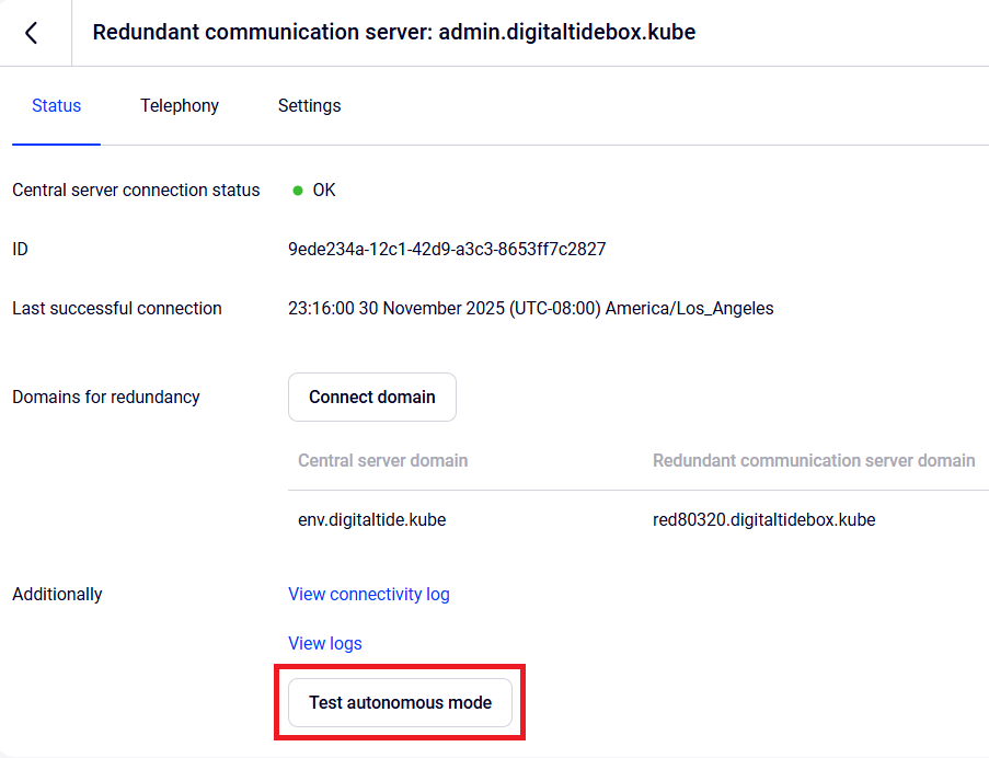 You can now test the redundant communication server. To do this, go to the Status tab and in the Additional section, click Test autonomous mode.