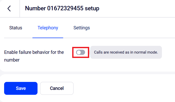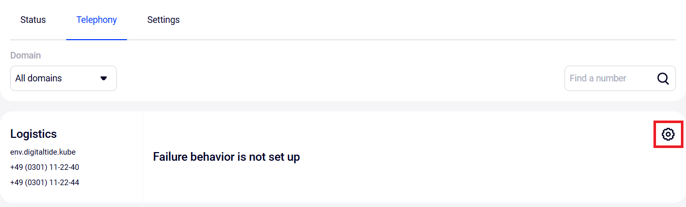 5. Set up scenarios for incoming calls to Cloud PBX numbers when a branch becomes disconnected from the center. Go to the Telephony tab and click the gear icon next to the required number.