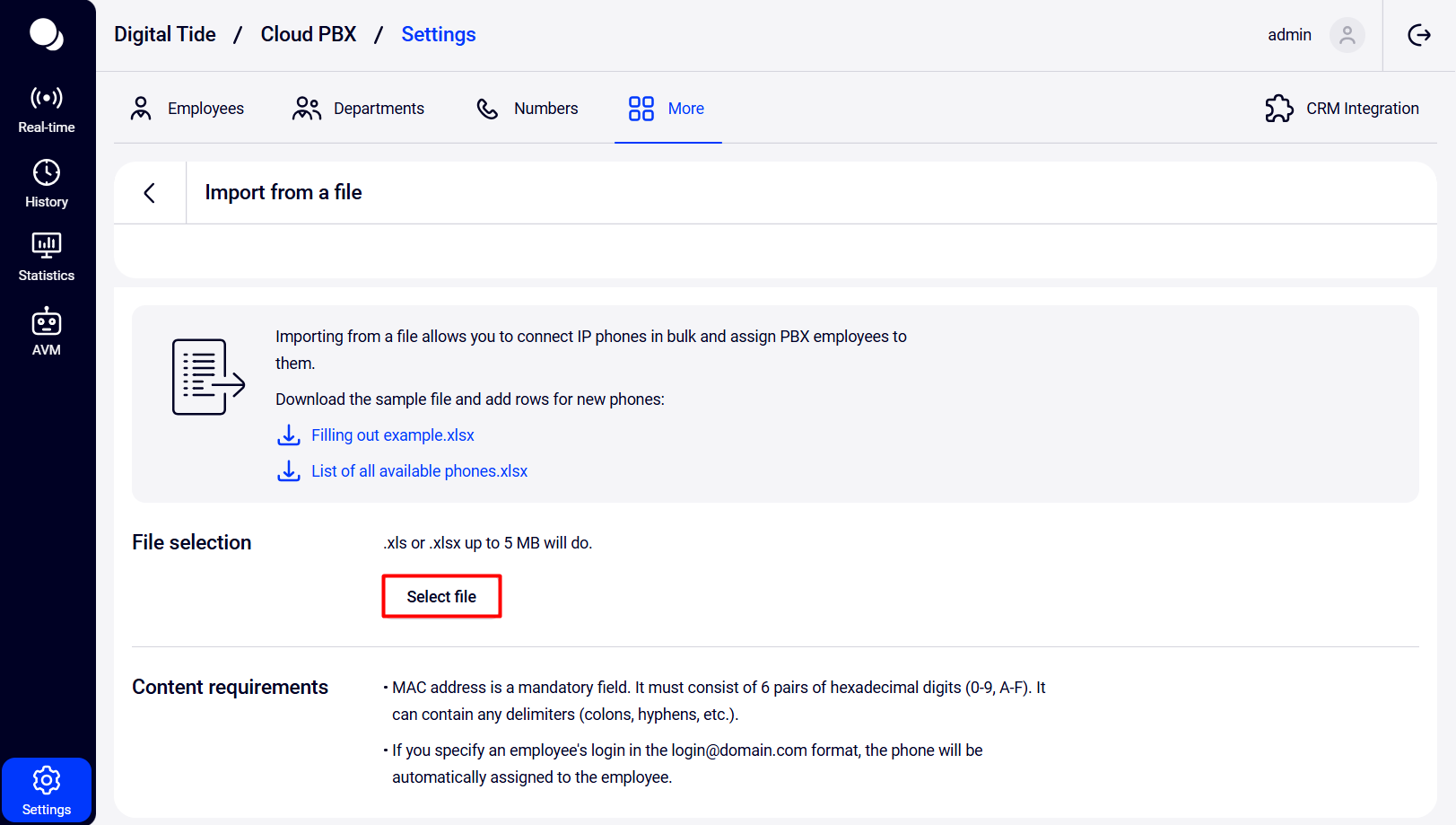 Download the spreadsheet template, fill it out according to the requirements, and upload it to Cloud PBX.