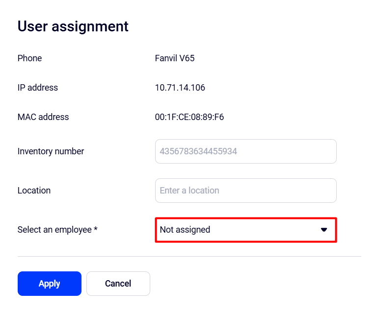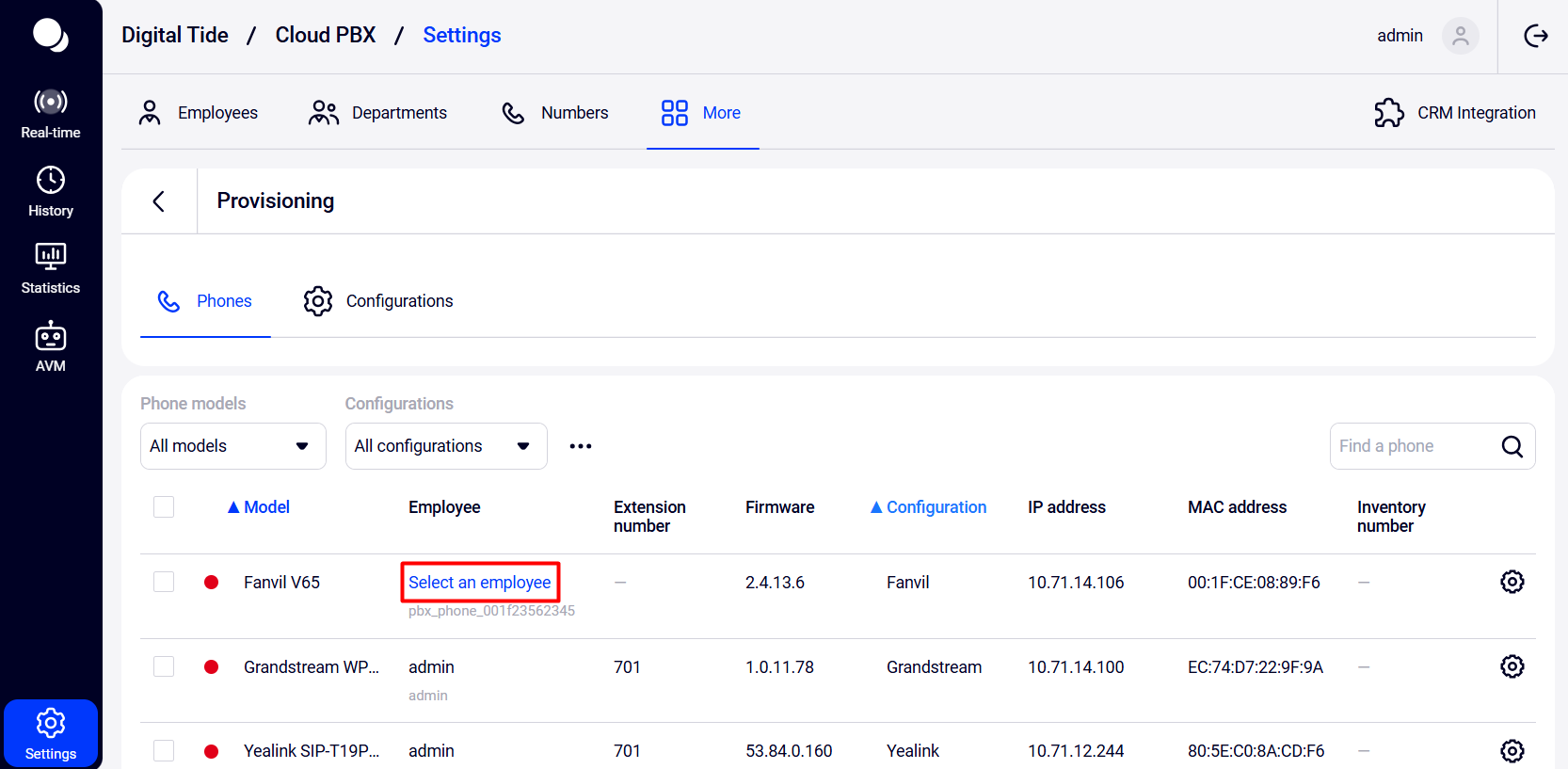 If a phone is not yet assigned to an employee, click Select an employee in the row of that SIP phone.