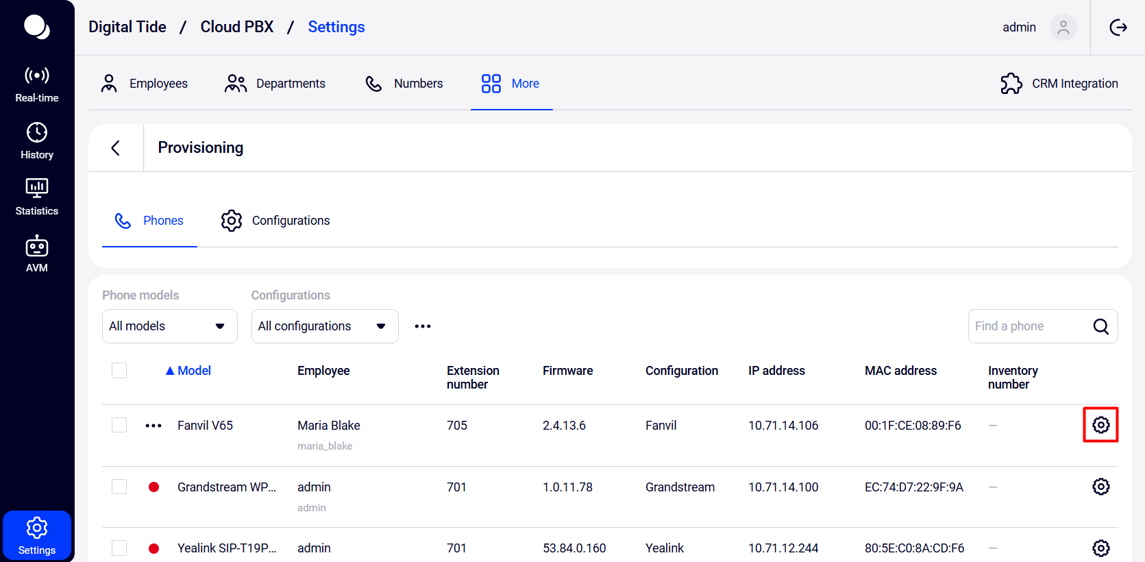 • Phones: for viewing and managing connected SIP phones, assigning them to employees, and configuring device settings.