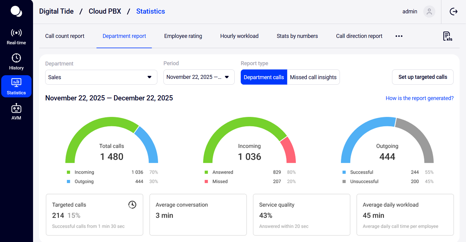 Thanks to statistical reports in Cloud PBX, you can monitor the dynamics of calls to the company, evaluate employees’ work, analyze the efficiency of advertising campaigns directly in the Cloud PBX interface, as well as control the processing of missed calls and much more.