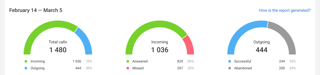 • total number of handled calls — the quantity and share of incoming and outgoing calls in the department during the selected period, and which type of calls creates the heavier workload;