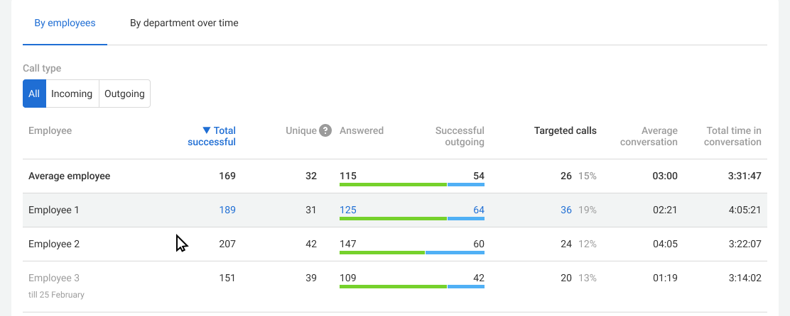 To evaluate each employee’s contribution to department results, use the employee calls table: for all calls or separately for incoming and outgoing ones.