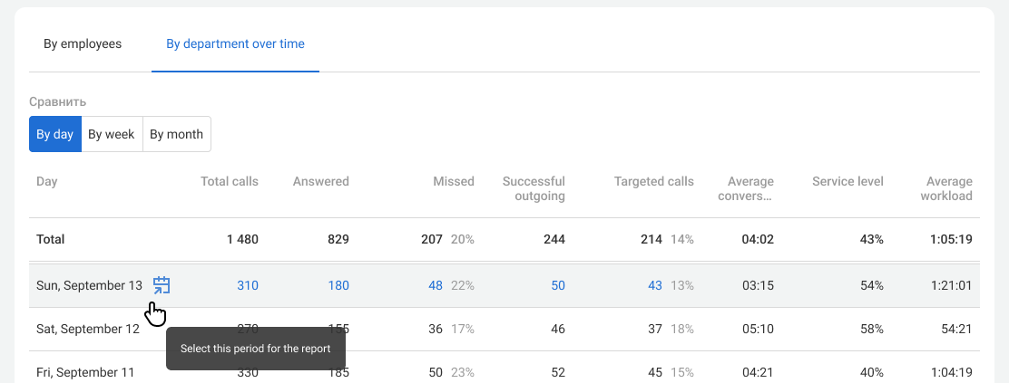 When comparing results by day, pay attention to peaks in incoming and missed calls. If the average employee workload is also high on those days and the service level is lower than usual, you may need to increase the number of employees on the line.