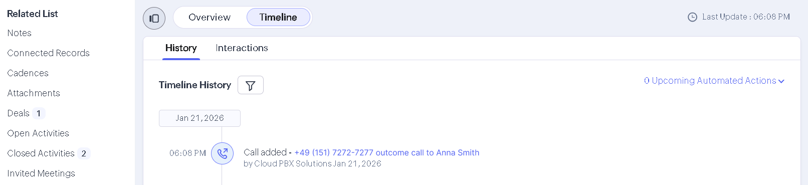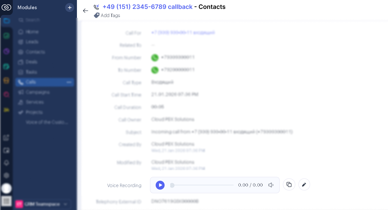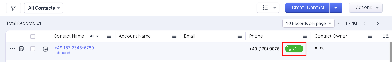 Based on your business needs, you can configure which events are triggered automatically in Zoho CRM for each type of call (incoming or outgoing, successful or unsuccessful, from a familiar or an unknown number). Zoho CRM can automatically create: