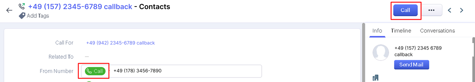 • From the contact or call card: click the Call button in the top right corner or the green button next to the customer’s number.