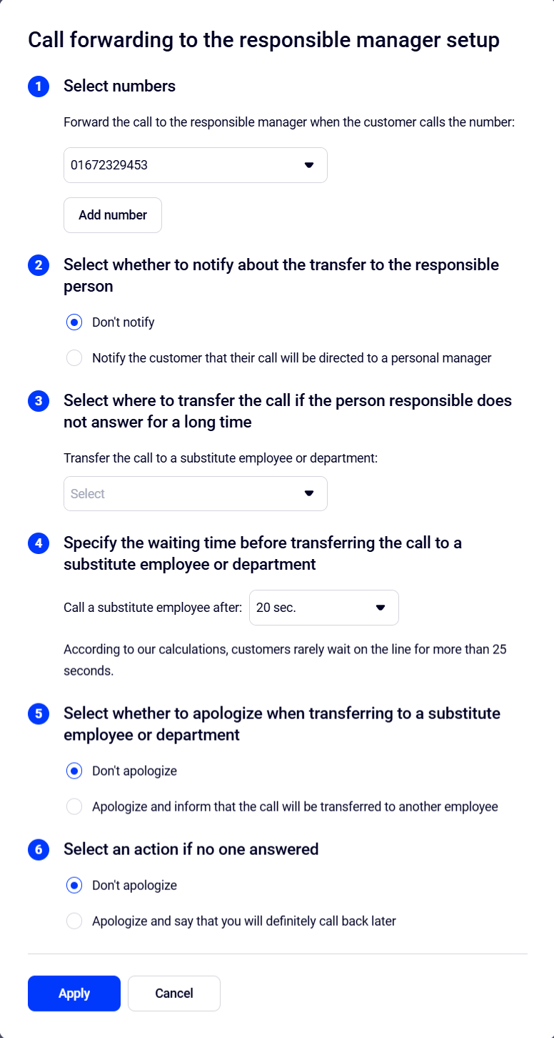 If you assign personal managers to customers, you can connect them automatically — the customer won’t need to navigate an IVR or speak with a receptionist or other managers. As soon as your company receives a call, Cloud PBX will route it to the employee responsible for that customer.